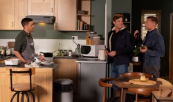 THEO EXERCISES TODD’S JEALOUSY Theo serves pastries for breakfast and Todd’s relieved to see he’s in a better mood. Having finished the pastries, Theo insists they go for a run to burn off the calories. When Todd refuses as it would make him sick, Theo asserts he’ll go alone. James spots Theo and offers to go for a run with him. When Theo receives a message from Todd telling him he’ll join him after all, Theo tells him not to bother as he’s found a new running buddy.